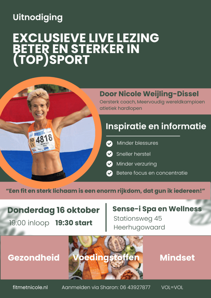 Tijdens deze inspirerende live-avond neemt Nicole Weijling je mee in haar verhaal en kennis over gezondheid, sport en prestaties. Ooit kampte zij met serieus overgewicht, lichamelijke klachten en dagelijkse ongemakken. Inmiddels is zij OERsterk, wereldkampioen hardlopen, gediplomeerd leefstijlcoach en een veelgevraagd spreker en inspirator.