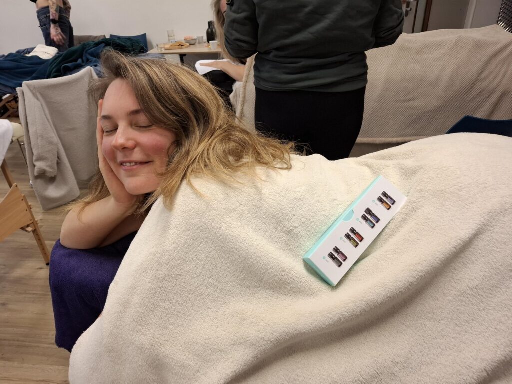 Hoewel het geen massage is, voelde de zachte, rustige aanraking ontzettend prettig. Mijn lichaam ontspande en ook mijn hoofd werd steeds stiller. Vooral de aanraking op mijn voeten gaf mij dat laatste zetje om echt los te laten en in een diepe ontspanning te zakken.